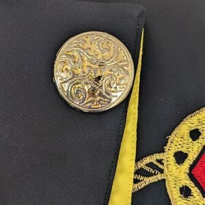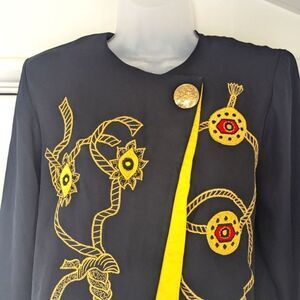 Description: Vintage Jusmica Black Embroidered Top Witchy Romantic Whimsigoth Celestial Fairy Cosplay Steam Punk Japan, concealed buttons down the front, asymmetrical front, purple-yellow cuff detail, beautiful embroidered rope medallion pattern on the chest, shoulder pads, Japanese brand, discrete flaw on the yellow trim but overall she's in great condition