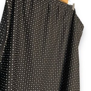 Black polka dot knee length skirt. The skirt does have a kick slit in the back. Good overall condition. No rips or stains. The elastic band in the skirt doesn't have much stretch its pretty stiff from age and wear.