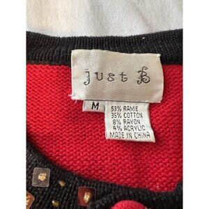 The VTG Just B Button Up Cardigan in size MED is a vintage-inspired piece perfect for those who love equestrian and western themes. This red cardigan features a tight-knit design, long sleeves, and a classic crew neck. Made from a blend of ramie, cotton, and acrylic, it is ideal for both casual and party occasions in the winter and fall seasons. Accented with jewels, buttons, rhinestones, and sequins, this heavyweight cardigan adds a touch of sparkle to your outfit. Hand wash only to maintain its quality and fit.