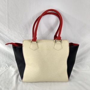 Killer looking KC Reation Color Block Purse. Very clean showing almost no use. Heavily constructed bag with strong metal fixtures. Believe this to be vinyl or PVC. The only real wear is some blemishes, darker areas on lining inside bag, otherwise very clean. See photos. MEASURES: 12 X 11 X 14 with a 8" handle drop. Cool, modern looking bag.