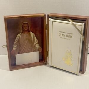 VTG KJV Holy Bible Illustrated Memorial Edition Wood Cedar Box Union Made USA