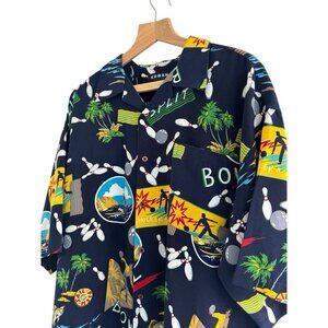 VTG KOMAN Sport Men's Sz XL Blue Hawaiian Camp Button Down Shirt Bowling Pins
