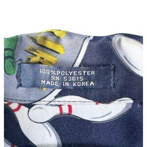 Vintage KOMAN Sport men's Hawaiian camp shirt. Shirt is short sleeved and buttons down the front. It's blue and done in a bowling print, including bowling pins, and images of a man bowling. But because it's also a Hawaiian shirt it also shows a beach, fish and palm trees. It's made of 100% polyester and is a man's size XL. True vintage made in Korea.
