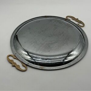 This vintage Kromex serving tray features a round shape with silver chrome material and gold brass handles. Made in the United States during the 1960s, this original piece is a Mid-Century Modern collectible. Please be aware that this product may contain chemicals known to the State of California to cause harm.