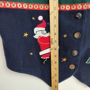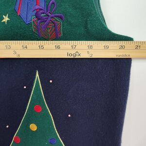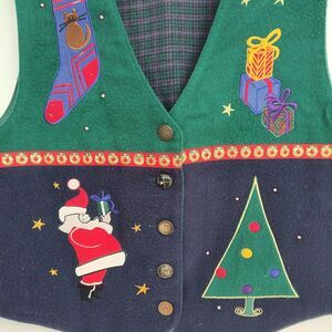 The vintage Karen Scott Christmas Sweater Vest is a festive and cozy piece perfect for the holiday season. This women's vest features a classic green color with embroidered and beaded accents, adding a touch of whimsy to the design. With a sleeveless style and V-neckline, this vest offers a comfortable fit and a stylish look. Made from acrylic fabric and flannel accents, this sweater vest is sure to be a standout addition to your winter wardrobe.