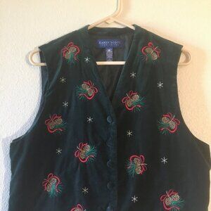 VTG Karen Scott Ugly Christmas Velvet Vest 100% Cotton Embroidered Pinecones Red Ribbons Snowflakes Size L