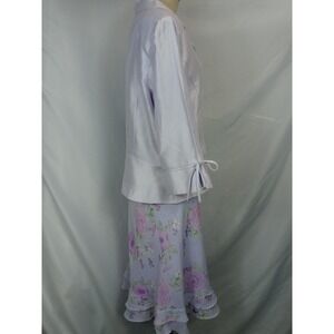 This beautiful set includes two perfectly coordinated pieces. The jacket is crafted from a lustrous lavender fabric and features a notched lapel with delicate floral embroidery, a button-front closure, and chic 3/4-length sleeves with tie details at the cuffs. The matching A-line skirt features a lovely floral print and a flowy, double-layered ruffled hem that moves beautifully.