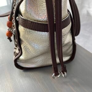 80s 90s Y2K Boho bohemian tribal Southwestern style woven fabric with metallic and brown faux leather accent and drawstring details.
