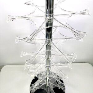 Features a chrome center pole, multiple clear acrylic rotating tiers, and a sturdy weighted base.