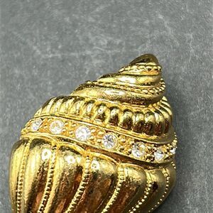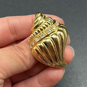 Elegant gold shell brooch adorned with sparkling rhinestones. Perfect for adding a touch of glamour.