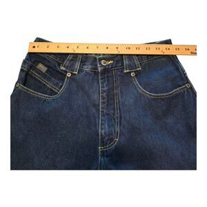 Vintage Kikwear K.Lab jeans in blue denim, showcasing iconic Y2K skater style with utilitarian vibe. Featuring a button & zip fly closure, cargo pocket with a buckle strap detail, and contrast yellow stitching for visual punch. Crafted from 100% cotton, offering sturdy, non-stretch structure. Tagged size 30. Collectible vintage rave essential.