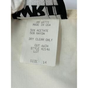 Fabric is 50% rayon and 50 acetate. Dry clean only. Two pockets on front. Cream colored fabric that is flowy Has floral ribbon sewn on for a decorative detail and faux pearls for accents.
