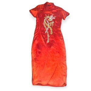 VTG Kimono Red Embroidered FLORAL BIRDS dress. No size tag. Would best fit a small/ medium? But please refer to measurements