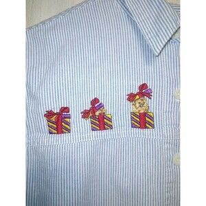 VTG Kitten Button Up Shirt Women Large White Embroidered Striped Kitties Cat