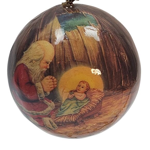 VTG Kneeling Santa Baby Jesus Christmas Ornament '91 Roman Inc Papier Mache Ball
