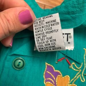 VTG Koret teal green button down blouse bright floral embroidery beading MEDIUM
