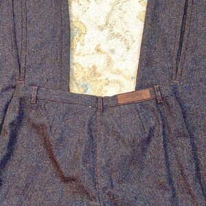 Step into timeless Italian craftsmanship with these vintage Krizia Jeans wool-blend trousers, beautifully tailored in a deep espresso tweed flecked with rust and blue. Featuring front split hems for a modern sculptural flare, a structured waist with hidden closure, and luxe mixed fibers of wool, silk, and polyamide — these pants blend warmth, texture, and sophistication.