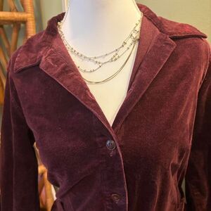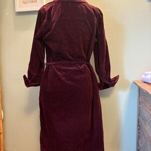 L.L. Bean - vintage burgundy corduroy belted dress with button-up front and pockets and pointed collar. No flaws.
