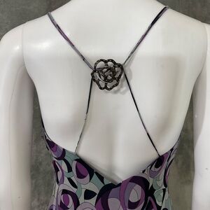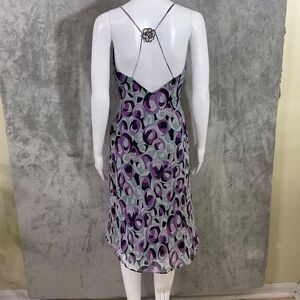 VTG. LAUNDRY Shelli Segal Fairy silk slip Dress Women's 6 purple artsy cowl neck w Rhinestone pin added. Purple + multi colors lined.