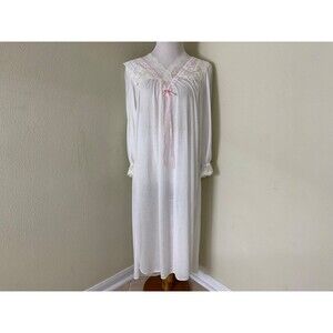 Vintage Made in USA LILY OF FRANCE Granny core Cottage core NIGHTGOWN SZ L Cream SATIN ribbon , LACE to neck and wrist. This is a pre owned vintage piece and has feel / look of pre owned including nap, piling, discolorations loose threads, creases, wrinkles,thin material and usual wear to it please look at all pictures for detail conditions & sizing. Please ask questions before purchase. Smoke free home.