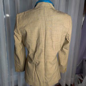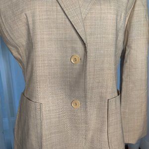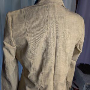 This Liz Taylor Jacket is perfect for everyday wear. You can dress it up or down and go from the office to night out with the girls. It's a cream color with tiny white stripes. It has 2 buttons down the front and two pockets. It has 3 buttons on the cuffs and it's lined with a cream and edged with pink. The cut is meant to compliment your waist as you can see in the photo of the back of jacket. It's a size 8 and dry clean only. In Excellent condition!