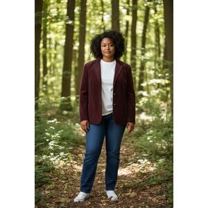 Add a classic and versatile piece to your wardrobe with this vintage L.L. Bean burgundy wine corduroy blazer. The blazer features a button-up front and is made of a comfortable and durable cotton blend. It's a mid-length basic jacket with long sleeves and pockets, perfect for travel, casual, or workwear occasions.