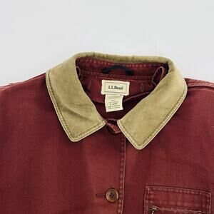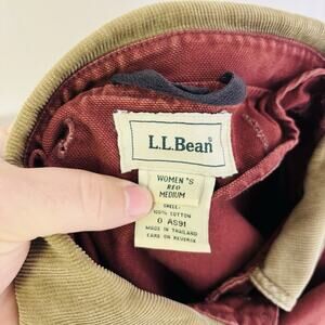 The VTG LL Bean Women's Barn Field Jacket in Petite Size Medium is a classic and durable red canvas chore coat made from cotton fabric. With a mid-length and long sleeves, this jacket features a button closure, collared neckline, and multiple pockets for functionality. The vintage style jacket is perfect for travel, casual outings, or workwear, and is designed to be water and wind-resistant, making it ideal for outdoor activities in all seasons. Made in the United States by the iconic brand L.L. Bean, this jacket embodies a timeless Americana aesthetic with a touch of retro flair.