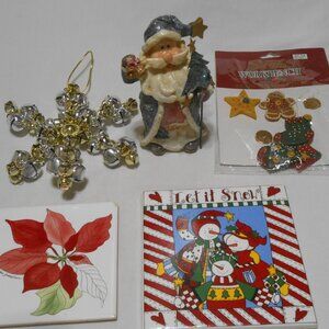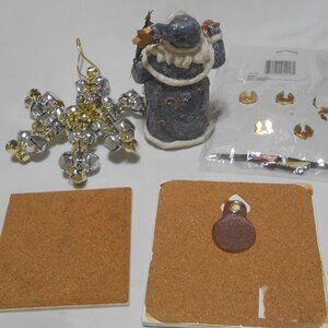 This product is a lot of vintage Christmas items like Santa's workbench resin button covers, a glitter Santa figurine, 2 christmas design tiles of let it snow hanging tile and coaster tile that is chipped on the corner and one jingle bells hanging gold and silver star ornament. Made by Santa's Workbench, these multicolored tiles are original and perfect for holiday and seasonal collectibles. The resin material figurine adds a festive touch to any Christmas decor, making them a charming addition to any holiday display. All my items are shipped the same day that payment is received from a clean, smoke free, home!