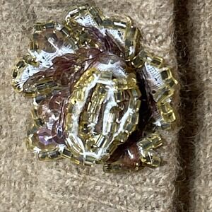 Enchanting cardigan whispers tales of refined elegance. Soft lambswool blends seamlessly with luxurious angora rabbit hair, creating a cloud-like texture that begs to be touched. The sophisticated camel hue serves as a timeless canvas for delicate embellishments; shimmering pearl-like beads trace the neckline and placket, while ornate, jeweled flower buttons add a touch of captivating sparkle. A classic v-neck and ribbed trim provide a flattering, comfortable fit. This captivating cardigan is perfect for an elegant brunch, a sophisticated evening soiree, or a cozy yet refined afternoon tea. Measurements are 28" wide from underarm to underarm and 25" long.
