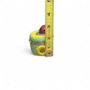 Adorable small trinket box featuring a ladybug perched on a sunflower. This piece is perfect for storing tiny jewelry or treasures, or adding a whimsical, nature-inspired accent to your home decor. Fits perfectly into the cottagecore aesthetic.