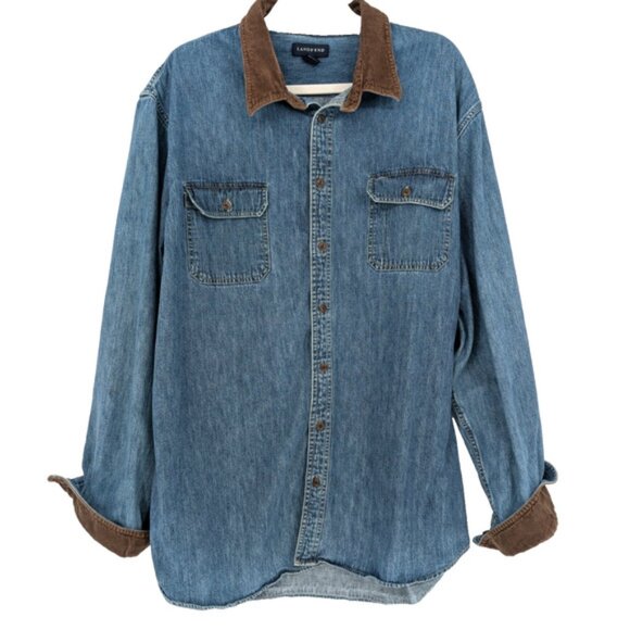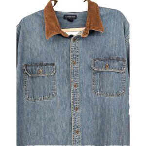 VTG Lands End Womens Blue Denim Chore Barn Shirt Corduroy Collar XXL Tall