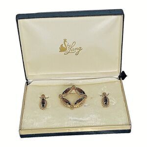 This exquisite jewelry set by Lang features a beautiful marquise-shaped topaz stone in a gold-tone metal setting. The set includes a brooch and clip-on earrings that are perfect for any special occasion, such as weddings, anniversaries, and birthdays. The vintage piece was crafted in the Retro era and is signed by the brand. The stunning set has a timeless beauty that will make any woman feel like a princess. Get ready to dazzle with this original Lang jewelry set!