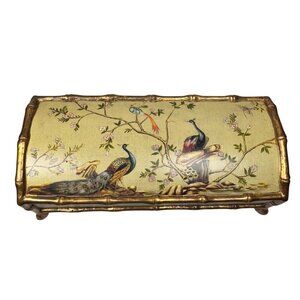 VTG Large Wooden Decorative Box Floral Bird Painted Asian Chinoiserie Footed