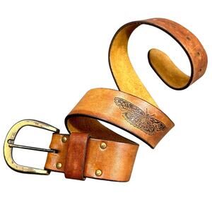 • Title: VTG Latitan Leather Belt 25 Brown Hand Tooled Stained Butterfly Brass Buckle Boho