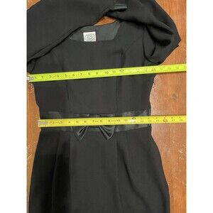 The VTG Laura Ashley Black Dress in size 6 features a classic Audrey Hepburn 50s style with a bow front and satin trim. Made of a wool blend material, this sheath dress has a vintage 1990s look with a mod/go-go vibe. With a chest size of 32 inches, waist size of 28 inches, and hip size of 36 inches, it is designed for a regular fit. The dress has a waist to hem length of 21 inches and a shoulder to hem length of 36 inches, making it a timeless and elegant choice for everyday wear.