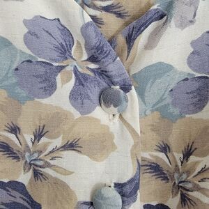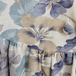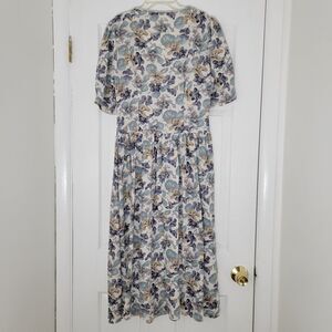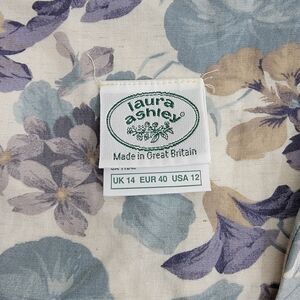 Excellent like new condition! Vintage Laura Ashley Made Great Britain Floral Puff Sleeve Midi Dress Size 12. Beautiful floral patten in muted beige, blue amd purple on cream background. Sweetheart neckline and front button closure until the waist