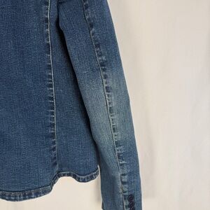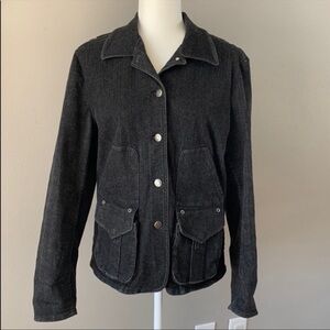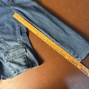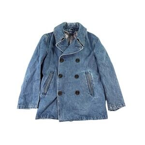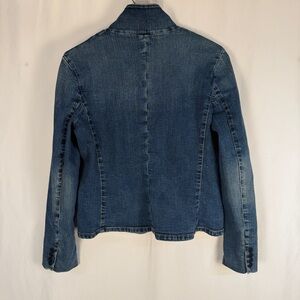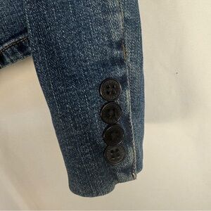 This is a vintage Lauren Jeans Co. Ralph Lauren denim blazer. The jacket features a mandarin-style collar (also described as a stand-up collar) and a three-button front closure.