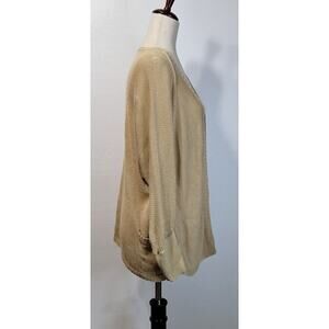 Offering for your consideration is a super cute cardigan sweater. It features dolman sleeves, knitted/crocheted and is made of 75% Linen, 25% Viscose.