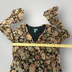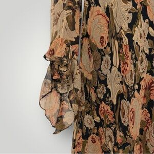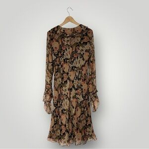 Elevate your wardrobe with this stunning Lauren Ralph Lauren wrap dress, featuring a romantic floral print in warm earthy tones. Designed with a flattering V-neckline, delicate ruffle trim, and long sheer sleeves with flounced cuffs, this dress exudes bohemian elegance. The soft, lightweight silk drapes beautifully, making it perfect for garden parties, weddings, or date nights.