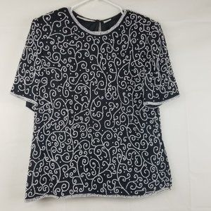 VTG Laurence Kazar Sz L Black Silk Pearl Beaded Evening Formal Top Blouse Womens Cocktail Attire Short Sleeve