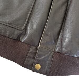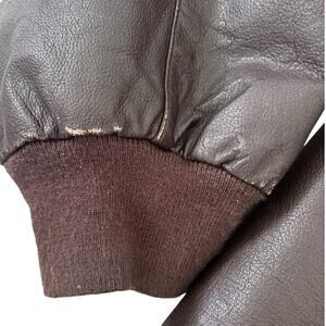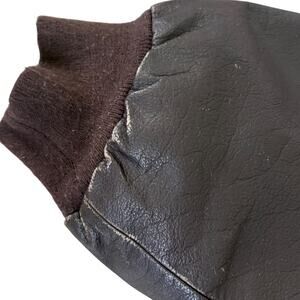 Pre-owned, good vintage condition. Some wear to leather (creasing, light scuffs), ribbed cuffs/hem show minor aging, and sleeves have light fading. No holes or major damage.