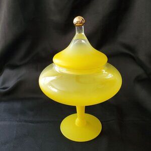 This mid-century modern yellow frosted glass compote adds elegance to any decor. The pedestal design with a detachable lid makes it versatile for storing or displaying items. Its unique shape and vibrant color make it a standout piece in any collection, offering both aesthetic appeal and functional use.