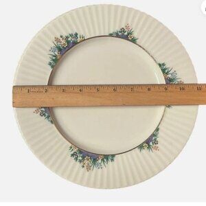 Classic vintage Lenox Rutledge P-303 dinner plates, crafted from fine bone china with a fluted, ridged edge and delicate hand-painted floral sprays, trimmed in 24-carat gold for timeless elegance.