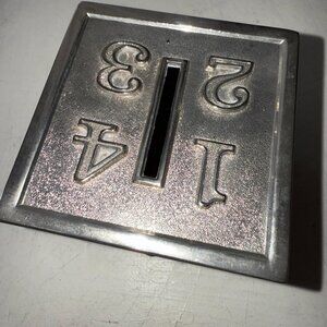 Vintage used condition! Some tarnish on the porous surfaces of the cube. Needs a good cleaning. 3" Cube Still Bank with Letters on the side & vintage coins on the top where the coin slot is located. Twist/screw-off bottom. Please look closely at all of my photos for exact condition. SKU C2