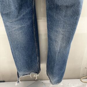 Jeans are in good condition overall. Lots of whisker fade on the front, wallet fade on the back, distress hole on the left thigh and some paint.