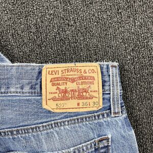 The product is a pair of vintage Levi's 527 jeans for men in a casual blue color. Made of denim with a mid-rise and bootcut style, these jeans feature a zip closure, 5-pocket design, and distressed accents. The Levi's logo is present on the fabric, and they are machine washable. With a size 36x30, these jeans are part of the Levi's 527 series, embodying a retro cowboy theme typical of 90s American fashion.