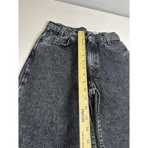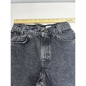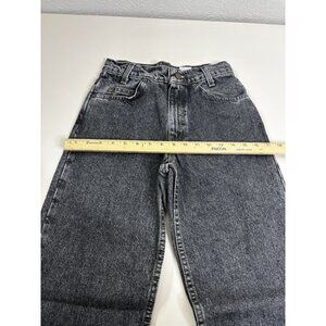 The product is a pair of vintage Levi's 550 jeans in size 27x32 (actual 24x30), featuring a relaxed fit with a mid rise. Made in the USA of cotton denim in a dark wash, these black jeans are accented with the signature orange tab and Levi's logo. The 5-pocket design with a zipper and button closure adds to the classic style and comfort of these versatile jeans, making them suitable for all seasons and various casual occasions. With a nod to hipster, USA, rock, and 90s themes, these Levi's 550 jeans offer a comfortable and stylish option for everyday wear.