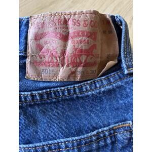 The VTG Levis Button Fly 501 Jeans for men in size 30x30 are classic blue denim pants with a straight style and distressed, faded look. These mid-rise jeans feature a 5-pocket design, easy care fabric, and are machine washable. Made from cotton denim, they also bear the iconic Levi's logo and come from the Levi's 501 Series. With a timeless button closure and a comfortable fit, these jeans are perfect for various seasons and occasions, adding a touch of hipster, retro, or rock vibe to any wardrobe.