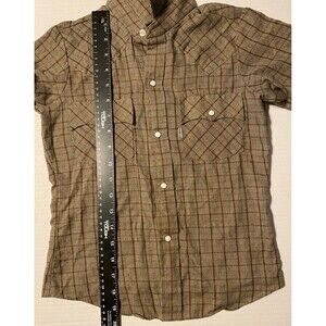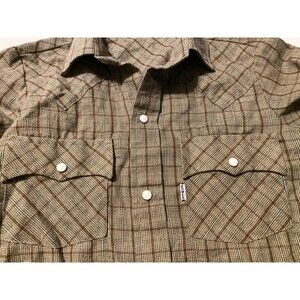 Vintage Levi's Plaid Western Shirt Pearl Snap Youth Small Boys sized 8-10 Rodeo made in Korea. Color is brown multicolor plaid print. Pearl snaps button closure.