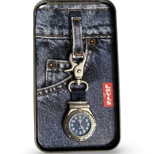 VTG Levi's Pocket Watch Clip Stainless Steel Navy Blue Quartz Tin Gift Box Japan